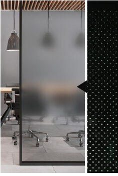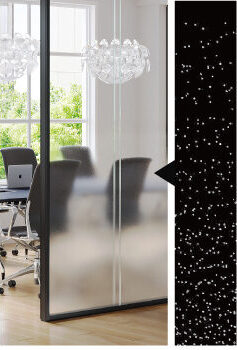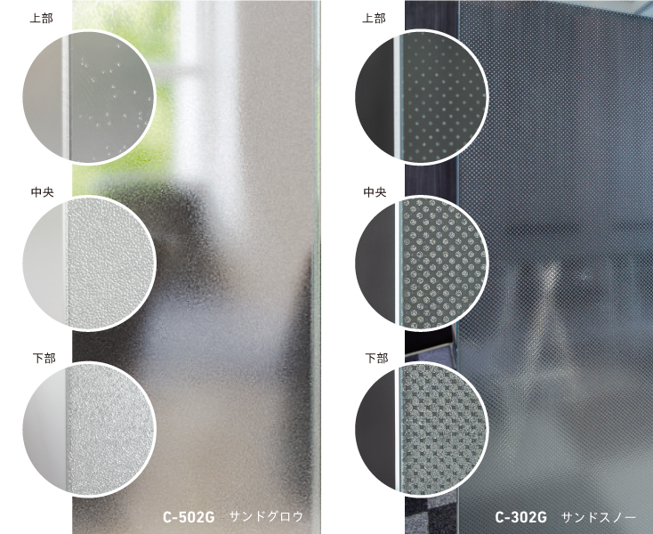 エンボスグラデーションは、スリガラス調シートで人気のフォグラスと同様のエンボスを持つグラデーションシートです。エンボス独特の凹凸の立体感と透明感が、印刷とは異なる自然で柔らかな印象の目隠しを実現します。 C-502G は、粒子状のパターンで滑らかなグラデーションを、 C-302G、C-303G はドットのパターンでグラデーションを実現しています。