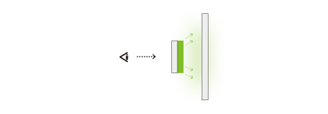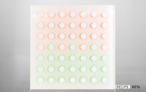 背面の白いシートに、表面に仕込まれた色付きシートの色をバウンスさせることで、淡く色が浮かび上がるような柔らかな表現が可能です。厚みや周囲の光の状況に応じて、色の見え方が変化し、動きのある奥行きを生み出します。