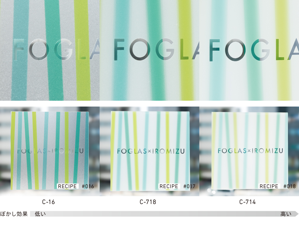 透過度が異なるスリガラス調シートを使うことで、透け感をコントロールできます。C-16 → C-718 → C-714順番で白色が濃くなり透明度が低くなるため、裏面の「IROMIZU」のぼかし効果が強くなっていきます。