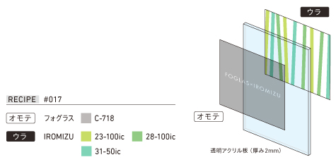 表面にスリガラス調シートの「フォグラス」を貼り、裏面に透明色の「IROMIZU」を組み合わせて、ぼかした透過色の表現を作り出しています。厚みが増すほどぼかしの効果は強くなります。