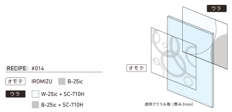 表面に「IROMIZU」の黒色、裏面には「IROMIZU」の白黒とハーフミラー貼り合わせたシートを組み合わせています。「IROMIZU」の白黒をハーフミラーに貼り合わせることで、反射を抑えた落ち着いた印象を実現。控えめながらもミラーの上品な効果を取り入れた表現が可能です。