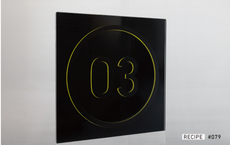 表面からは隠れる位置に裏面デザインを配置し、少し斜めから見ることで、アクリルの厚みによる視差でデザインが浮かび上がります。見る角度や厚みによって異なる印象を作り出すことが可能で、奥行き感と動きのある演出に最適です。